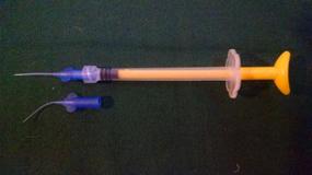 Once you feel the tip touch the bottom of the pocket back lift it slightly and slowly begin to push in on the syringe handle. While pushing in on the handle of the plunger, slowly move the tip of the syringe around the gum pocket in the area around the tooth to be irrigated. Do not push the plunger down too quickly as it will exert too much pressure at the bottom of the infected pocket.